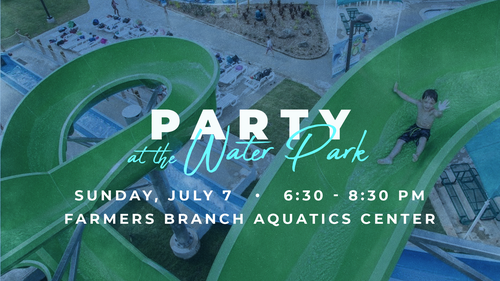 Branch Night at the Water Park is this Sunday, July 7 from 6:30 - 8:30p. This is a free event, and everyone from both campuses is invited to come and bring guests. Hot dogs, chips, and drinks will be provided. PLEASE BRING DESSERTS TO SHARE. This party is open to all ages! We will be gathering at the Farmers Branch Aquatics Center at 14032 Heartside Place, Farmers Branch, 75234. Don’t forget your towel!
